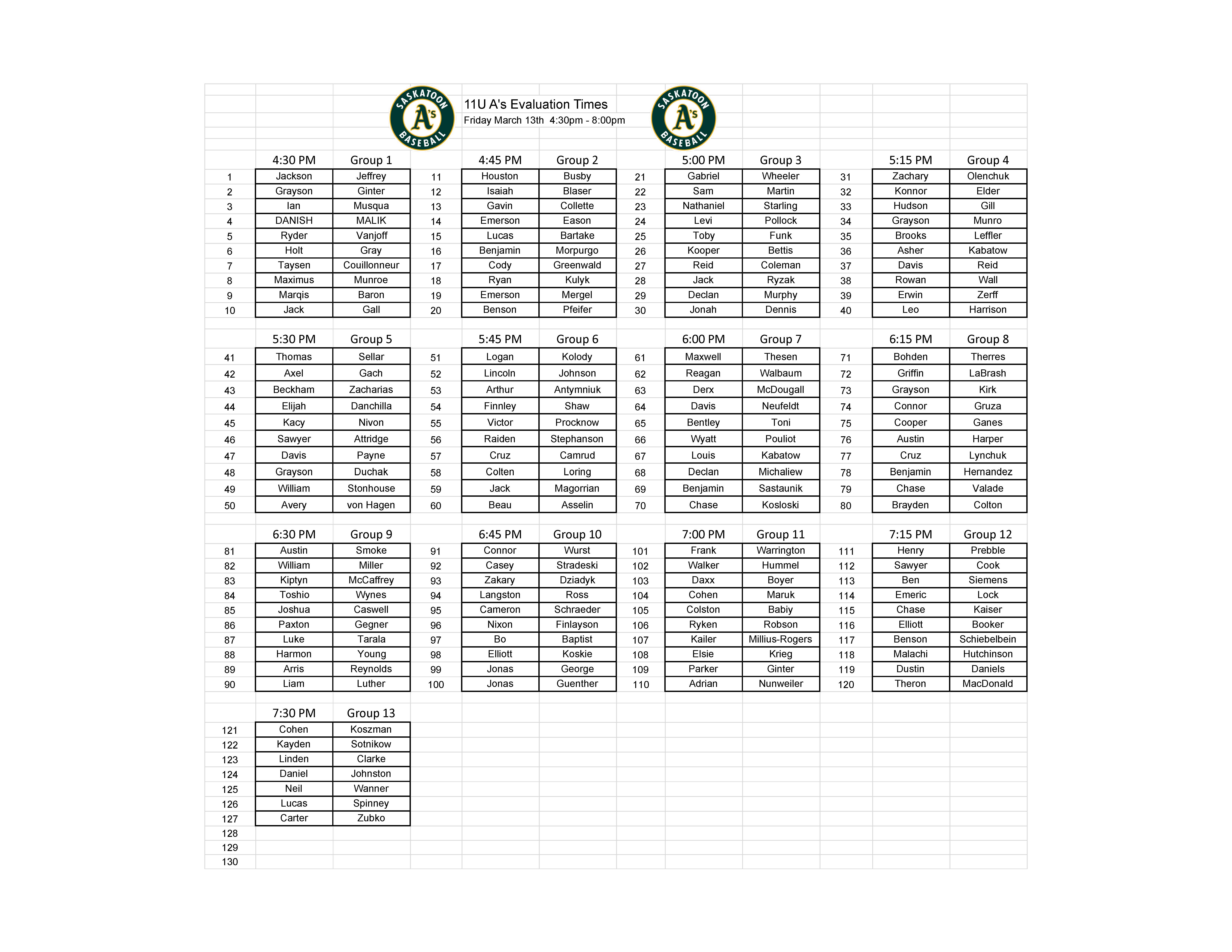 *** Please arrive at least 20 minutes before your scheduled start time to give your player time to check in and warm up. If you are late and the group you were supposed to be in has started, you will be asked to return at the end of that evaluation (if space is available). Example: You are #9 and you are late, if there are 100 people in that evaluation you will be asked to return and will then be given #101.
