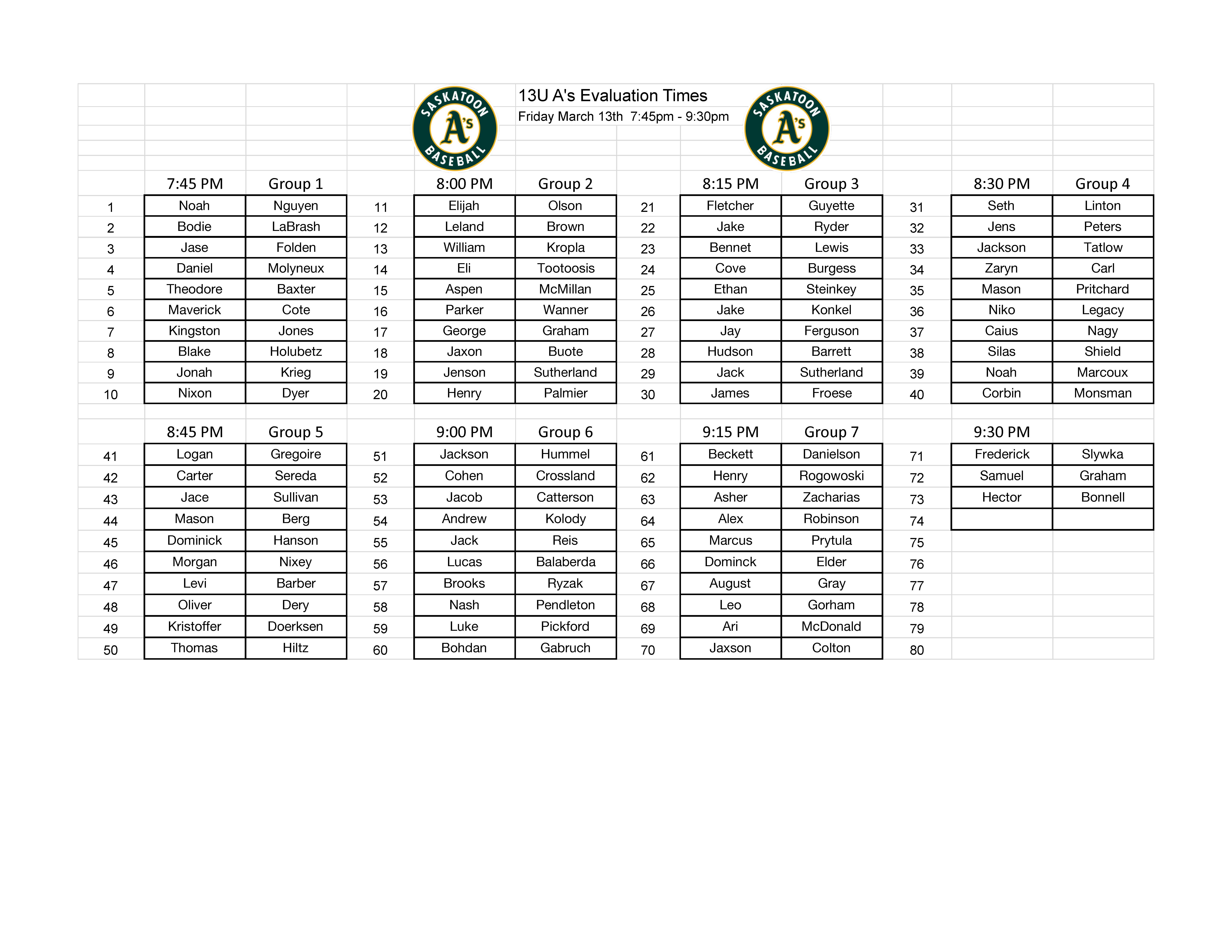 *** Please arrive at least 20 minutes before your scheduled start time to give your player time to check in and warm up. If you are late and the group you were supposed to be in has started, you will be asked to return at the end of that evaluation (if space is available). Example: You are #9 and you are late, if there are 100 people in that evaluation you will be asked to return and will then be given #101.